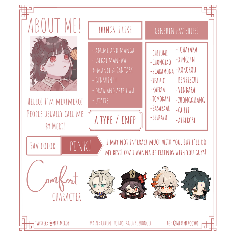 Mostly tweets genshinRT very LOTSReally like Chilumi and almost all my ships are straight. ( i dont mind BL or GL tho )Harsh word, caps, smash keyboard